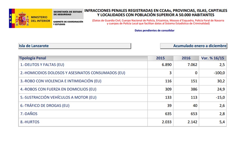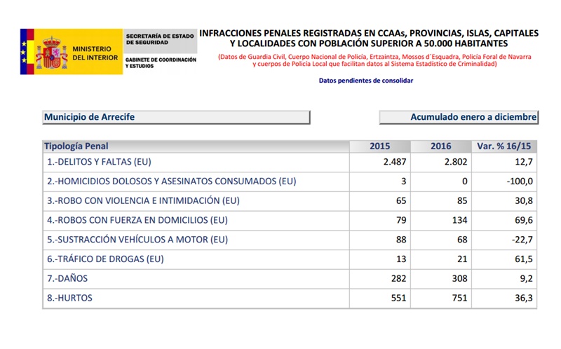 El Ministerio de Interior ha dado a conocer el balance del índice de criminalidad en 2016, que refleja que el año pasado aumentaron los delitos y faltas en Lanzarote. No obstante, el dato positivo es que el año se cerró sin ningún homicidio ni asesinato en la isla, mientras que en 2015 fueron tres las personas que perdieron la vida en Lanzarote en estas circunstancias.
