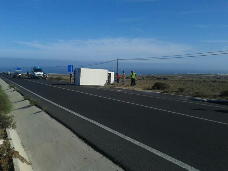 Un camión de reparto sufría esta tarde un vuelco en la carretera de San Bartolomé en dirección a Arrecife.