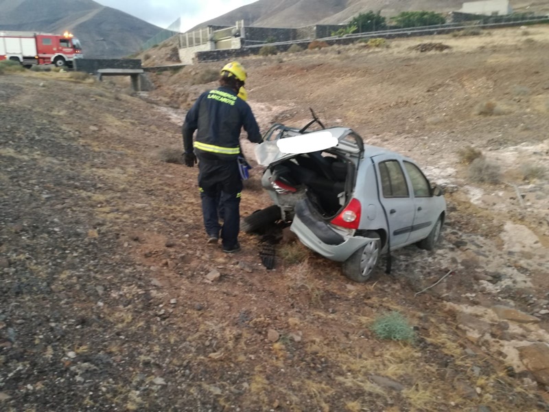 Según informan desde el Consorcio de Seguridad y Emergencias del Cabildo de Lanzarote, alertados por la Policía local hacia las 20.31 horas de una salida de calzada en la carretera 702, la vía que va de Playa Blanca a Femés, "nos trasladamos al lugar de los hechos y procedimos a desconectar la batería del vehículo". Posteriormente los bomberos limpiaron la calzada con agua a presión y aplicaron sepiolita en unos restos de combustible.