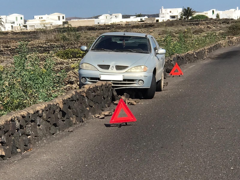Un coche aparecía este miércoles encima de un muro de piedras en lo que parece ser parte de La Geria, en la localidad de Masdache, en el municipio de Tías, uno de los paisajes más fotografiados del mundo.