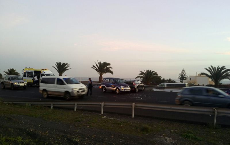 En el lugar también se personó una patrulla de la Guardia Civíl y de la Policía local. El suceso provocó tráfico y lento y largas retenciones en la carretera que conecta Arrecife con Playa Honda, desde la circunvalación a la altura de Maneje, hasta que los agentes han podido aclarar la zona del accidente y el servicio de grúas ha retirado los vehículos.