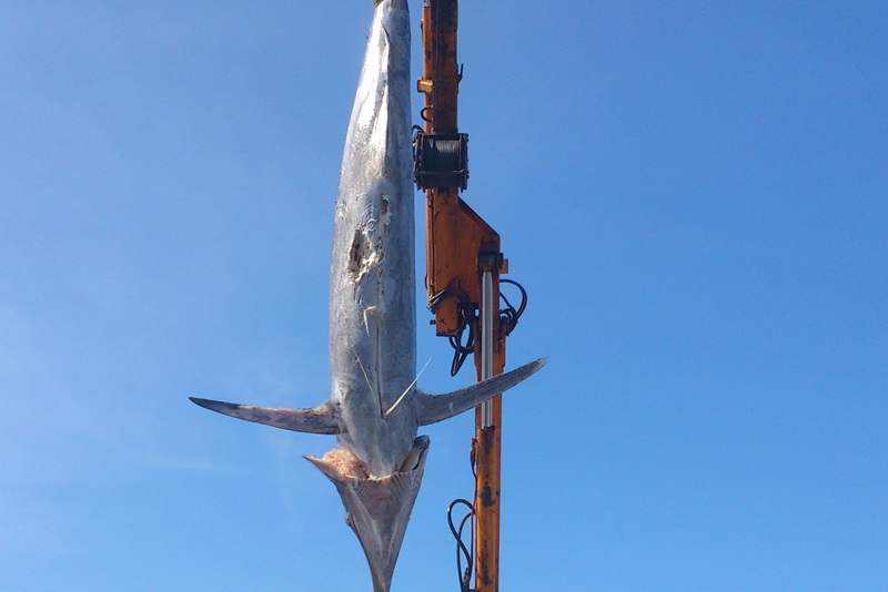 Al final, la Policía Local rescató el animal ayudado de una zodiac. El pez, que estaba en avanzado estado de descomposición, fue trasladado al puerto deportivo Marina Rubicón de Playa Blanca, que facilitó sus instalaciones para realizar la maniobra de desembarque.