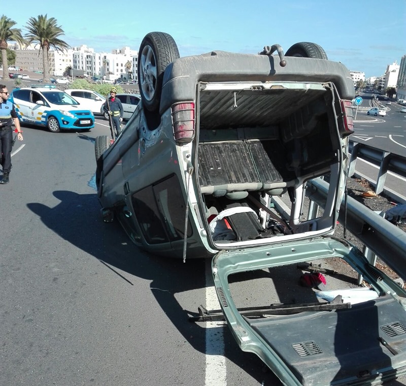 El vuelco de un turismo pocos minutos después de las 14:00 horas de este sábado en Arrecife, a la altura del Cabildo insular, provocó una gran retención del tráfico en la rotonda de acceso a la autovía (LZ-2), ya que el accidente se vieron implicados hasta tres vehículos, según los datos facilitados por el Consorcio de Seguridad y Emergencias.