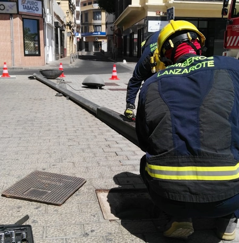 Fue sobre las 15.30 horas de este domino cuando los Bomberos fueron alertados por la Policía Local de Arrecife de una farola tirada sobre la vía pública.
