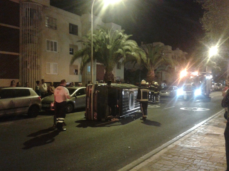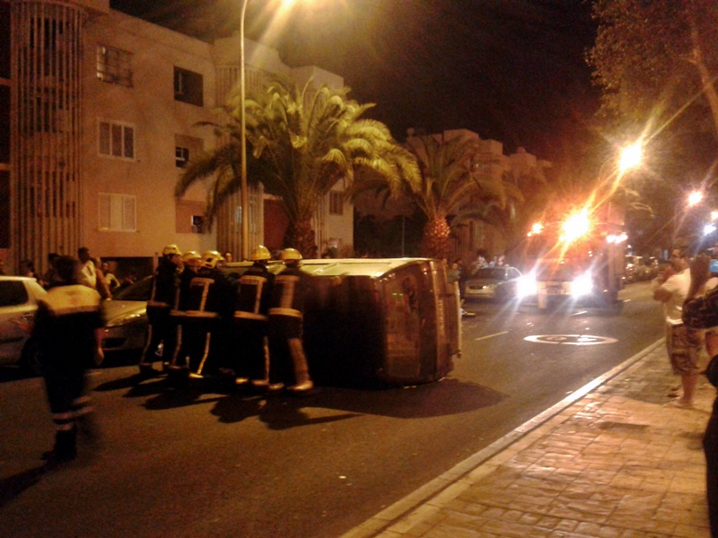 Los bomberos se encargaron de enderezar el vehículo y limpiar la calzada, mientras que la Policía Local cortaba el tráfico en esta transitada vía de la capital conejera.