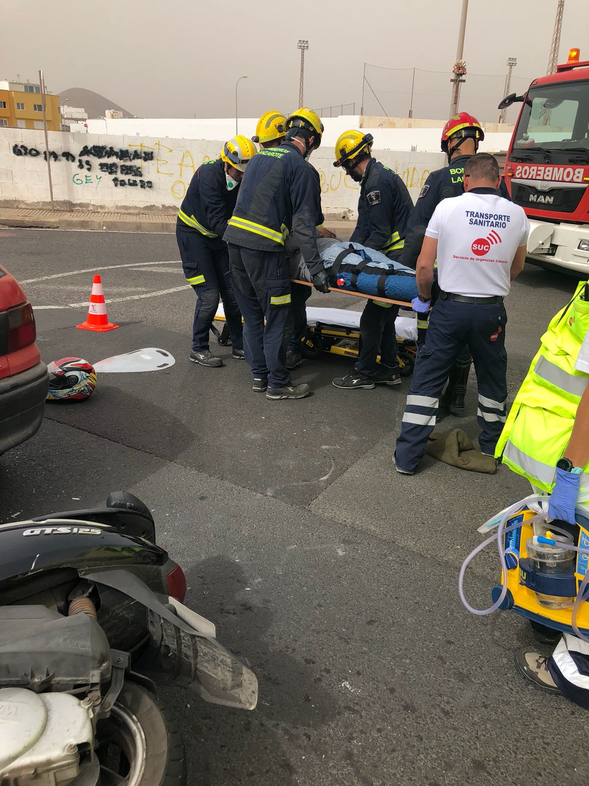Un varón de 26 años de edad, conductor de una motocicleta, ha resultado herido leve en una colisión contra un turismo acaecida en la tarde de hoy en el barrio de Argana Alta de Arrecife. En joven presenta traumatismos en un miembro superior e inferior, cuyo carácter es moderado.