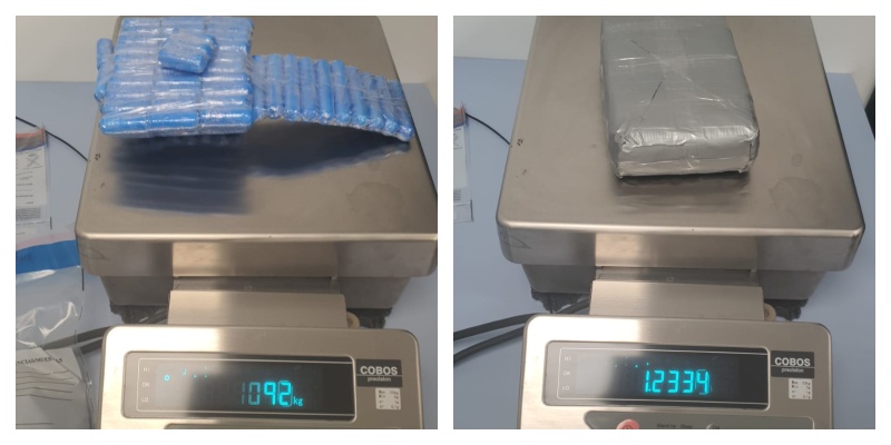 Los agentes de la Guardia Civil en el ejercicio de sus funciones, una vez abiertos los envoltorios e inspeccionado el contenido, realizan la prueba del narcotest, en el que pudieron comprobar que se trataba de una sustancia compacta polvorienta, dando positivo en cocaína, arrojando un peso aproximado de unos 2.350 gramos, procediendo inmediatamente a la detención de las dos personas implicadas en el hecho delictivo, por un delito contra la salud pública- delito de tráfico de drogas.