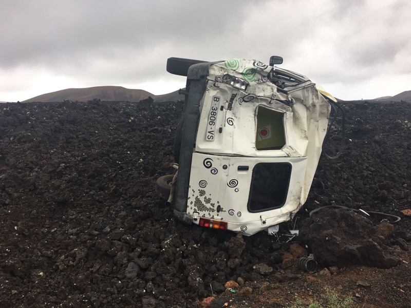 Dada la espectacularidad del accidente, el vehículo que conducía, una furgoneta de color blanco, sí ha resultado bastante dañado y ha quedado en medio de la lava que cubre la zona.