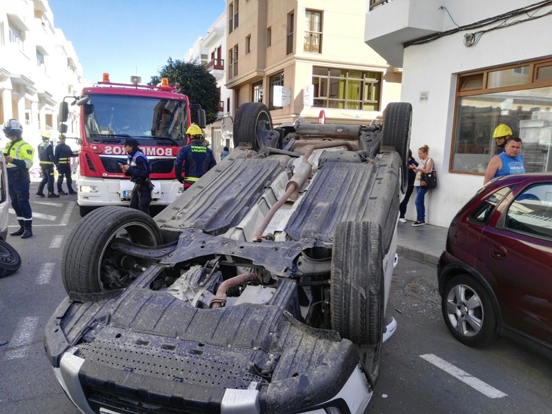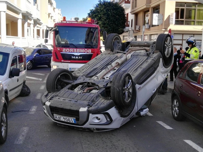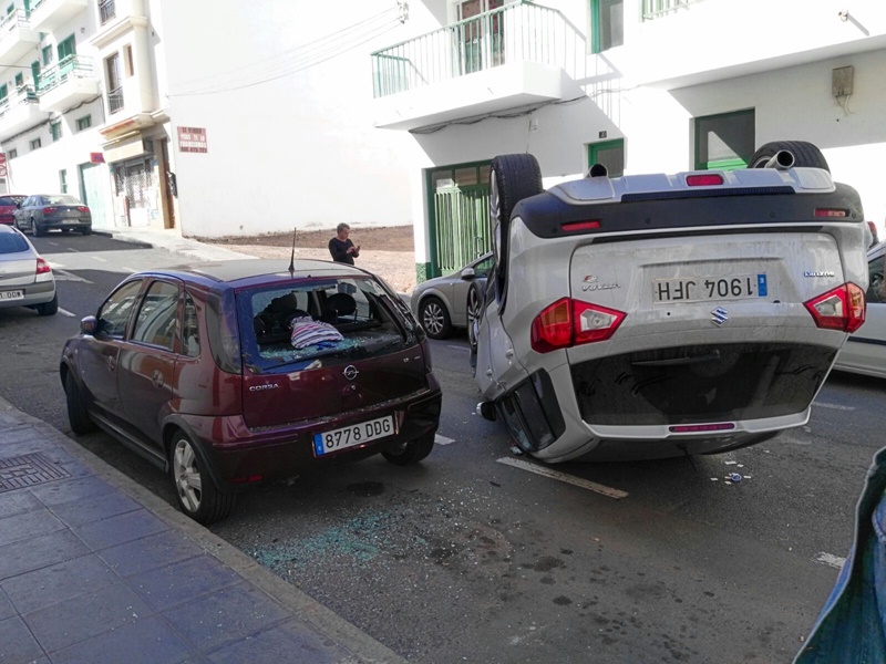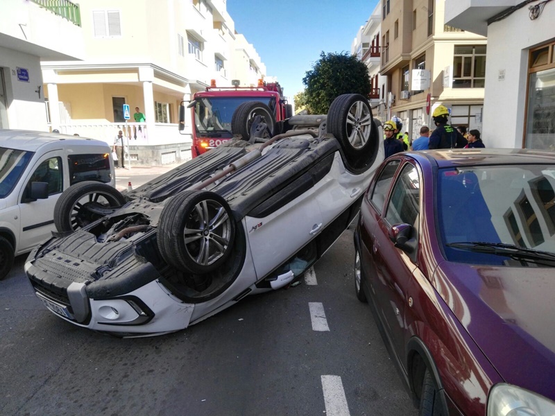 Espectacular accidente el registrado en la mañana de este lunes en pleno centro de Arrecife, donde un coche acabó volcando y causando daños a otros vehículos que estaban aparcados.