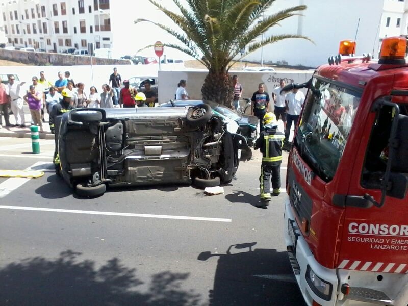 Una mujer de 64 años ha tenido que ser rescatada por los bomberos del interior de su vehículo, tras volcar en la Vía Medular de Arrecife, frente a la Estación de Guaguas.