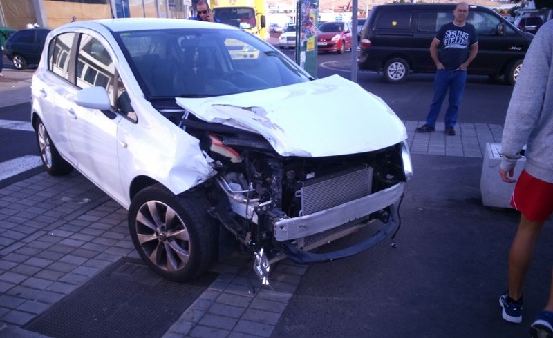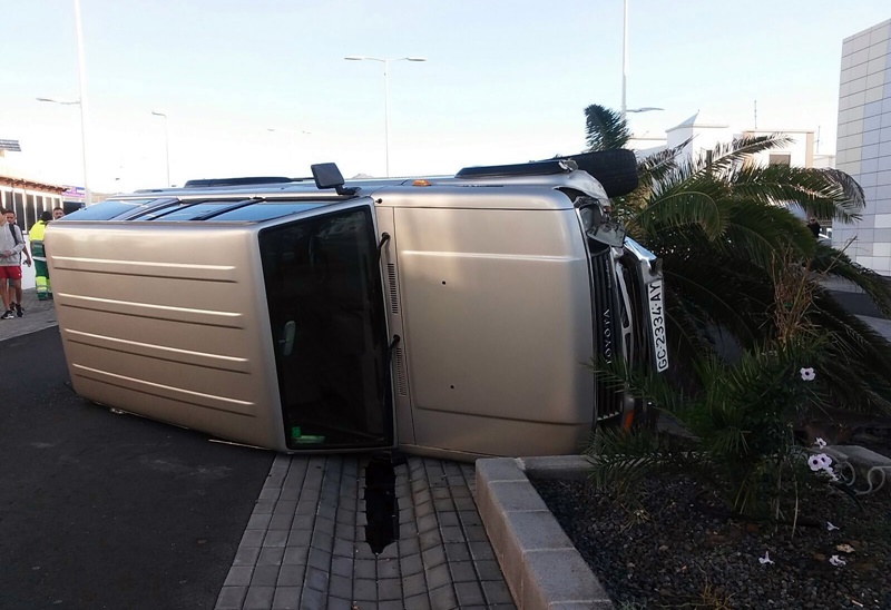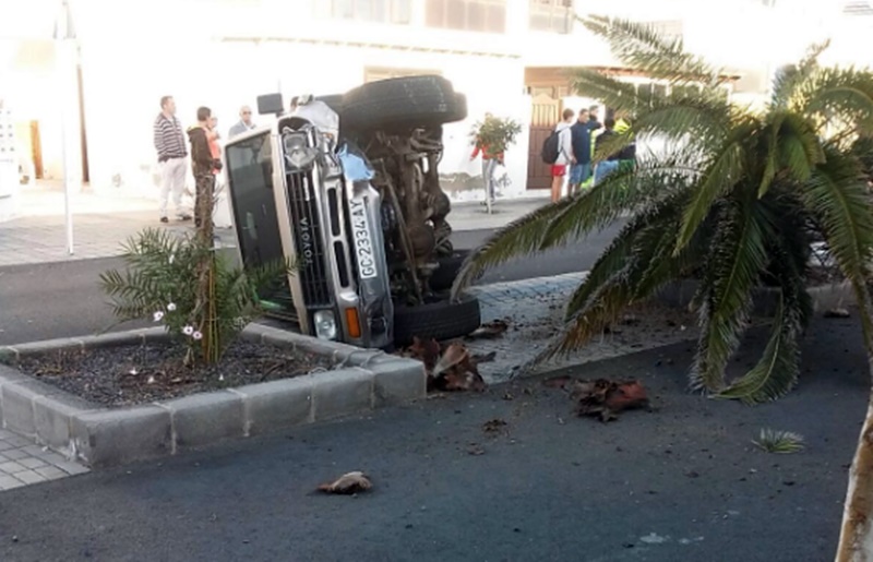 Vuelca en pleno centro de Playa Honda tras chocar contra otro coche