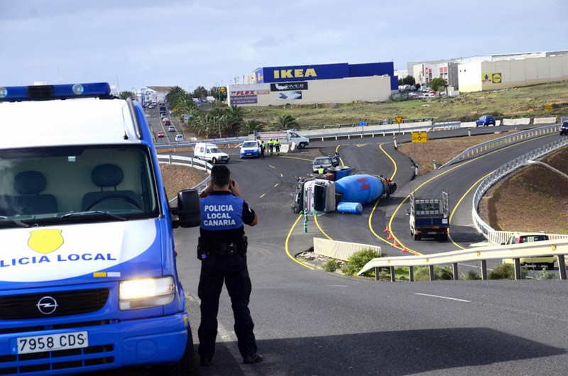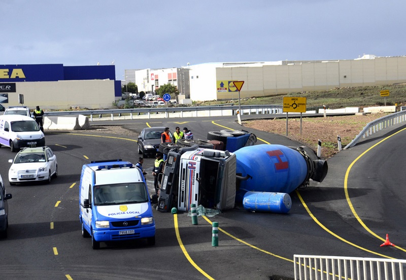 Un camión hormigonera ha volcado en la mañana de este jueves en la entrada a Costa Teguise por la Circunvalación de Arrecife. El conductor del vehículo ha resultado herido aunque, por suerte, sólo de carácter leve, según ha informado el 112.