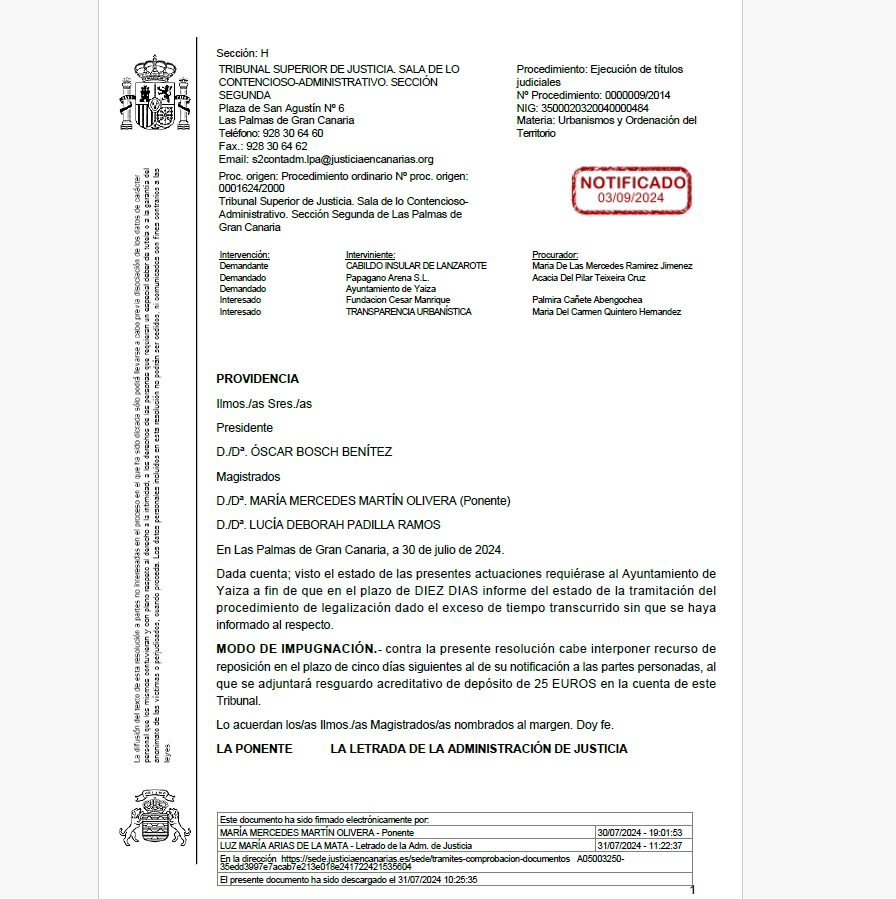 La realidad es muy tozuda y la verdad es que en ninguna de las dos providencias, se habla en ningún momento del Cabildo, ni tampoco de que deba ejecutarse la inexistente sentencia de ejecución del derribo del hotel. El pasado 30 de Julio la Sala solicitó al Ayuntamiento que le informara de en qué estado se encuentra el Procedimiento de Legalización del hotel Sandos Papagayo. SIMPLEMENTE. Como el Ayuntamiento no contesta, el 4 de noviembre la Sala requiere de nuevo al Ayuntamiento para que informe, y solicita que se le informe sobre quién es el funcionario responsable para sancionarle si persiste en no remitir el informe. El letrado del Ayuntamiento prepara un escrito por su cuenta pero no aporta el informe de ningún funcionario que es lo que ha solicitado la Sala, que seguramente va a solicitar que quien informen sean los funcionarios y no el letrado externo del Ayuntamiento. En cambio, el PSOE dice en su nota de prensa que el TSJC ha advertido al Ayuntamiento de Yaiza con sanciones económicas e incluso con la exigencia de responsabilidades penales si no se cumple con la ejecución de la sentencia que anuló la licencia ilegal del Papagayo Arena, un hotel que ocupa un vial público y vulnera la normativa urbanística. Insistimos nada de eso dice las providencias que ustedes pueden ver en este mismo Trasmallo. Lo único que hace la sala advertir que va a sancionar al funcionario sino le informa de cómo está el expediente, y pide que se le informe de quién es el funcionario responsable. Nada habla de responsabilidades penales sino de sanciones administrativas contra la funcionaria de 500 a 1500 euros. En fin, patético.