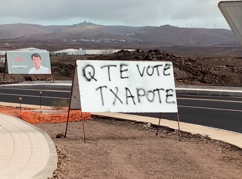 “Que te vote Txapote”, el eslogan que se ha generalizado en todo el país en plena campaña electoral para atacar al PSOE, recordándoles que se han apoyado en Bildu para gobernar, ha llegado a Lanzarote. En efecto, un cartel con esta frase se puede ver desde hace días en la rotonda próxima al punto limpio de Costa Teguise, y junto a un cartel del candidato socialista Marcos Bergaz al Ayuntamiento de Teguise, algo que no debe gustar nada ni a los militantes en el partido socialista ni a sus simpatizantes porque recuerda directamente al dolor que sufrieron no hace demasiados todas las familias de las víctimas de ETA. “¿Quieres mi voto?”, parece decir el cartel. “El mío, no, que te vote Txapote”, es la respuesta obvia.